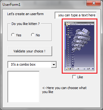 • You have to totally build the user interface through a userform (insert/userform) and add buttons, labels...